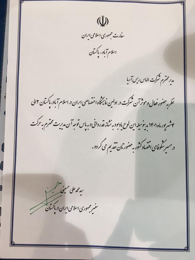 اولین نمایشگاه تخصصی جمهوری اسلامی ایران و پاکستان. حضور شرکت الماس ریس آریا در نمایشگاه اختصاصی ایران و اسلام اباد این نمایشگاه با حضور فعال صنعتگران کشور عزیزمان وهمراهی ۳۵ شرکت ایرانی در تاریخ ۲ الی ۴ شهریورماه در شهر «اسلام‌آباد» پایتخت کشور پاکستان گشایش یافت. افتخار حضور نساجی الماس ریس آریا در اتاق بازرگانی لاهور پاکستان با حضور سرکنسولگری ایران جناب آقای نظری و رئیس اتاق بازرگانی لاهور جناب آقای نعمان کبیر.
